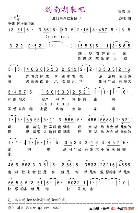 到南湖来吧(亦弛原创)(广场圆舞曲·厦门·)曲谱是由作词:任雪词作曲:亦弛演唱(奏):张亦弛,上传:咪迷米张亦弛,版权归原作者所有。