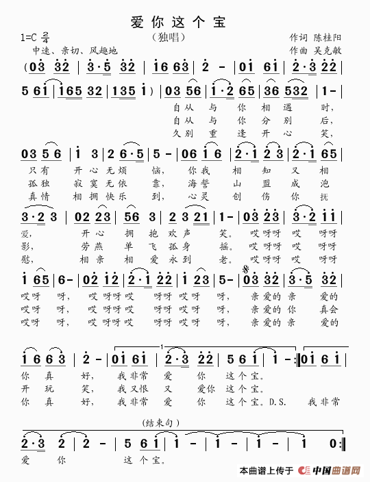 爱你这个宝(陈桂阳词 吴克敏曲)曲谱是由作词:陈桂阳作曲:吴克敏演唱(奏):李庆明,上传:吴克敏,版权归原作者所有。