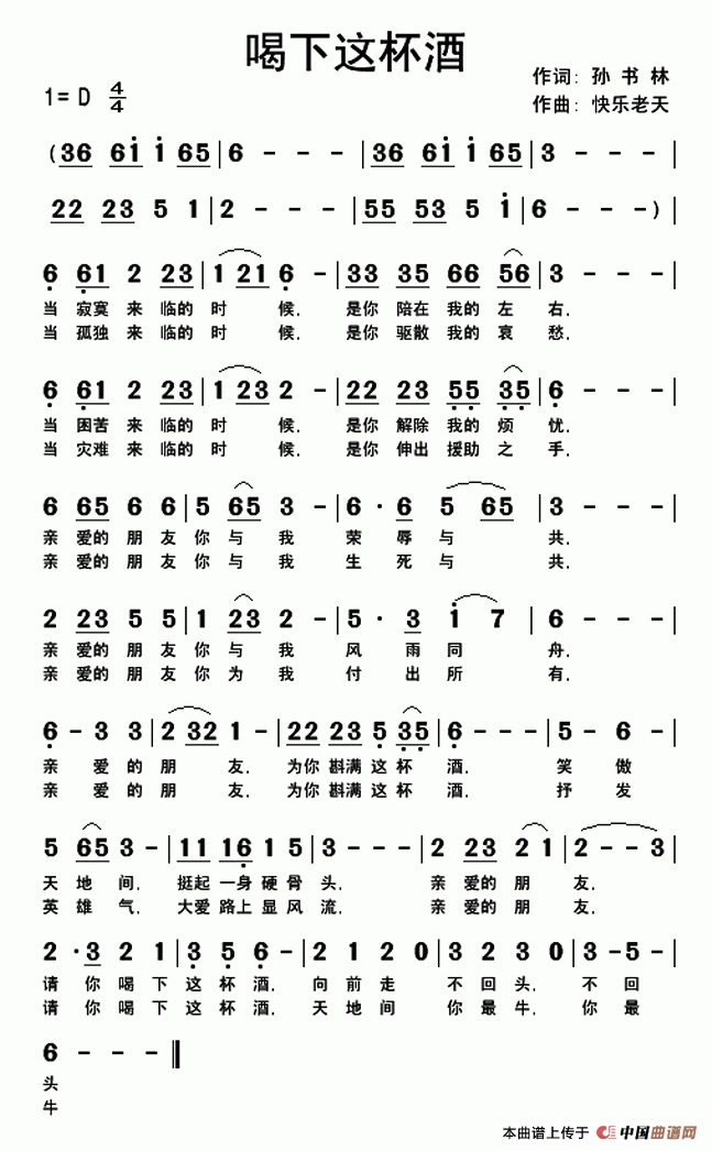 喝下这杯酒曲谱是由作词:孙书林作曲:快乐老天演唱(奏):寒月,上传:快乐老天,版权归原作者所有。