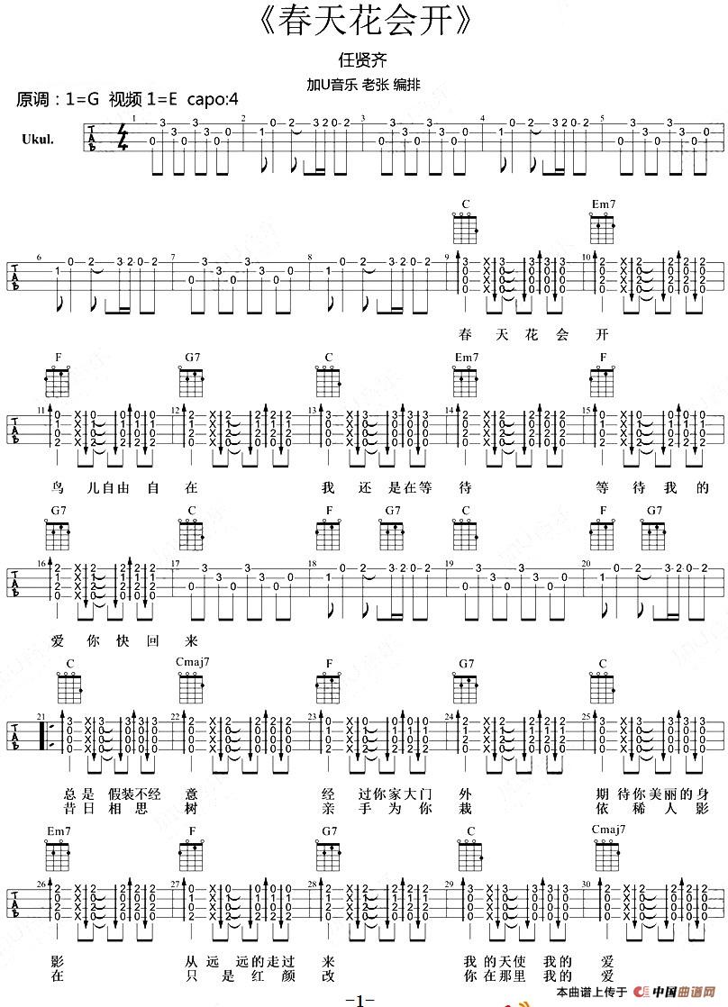 温馨提示:想要保存春天花会开尤克里里谱,展现春日烂漫曲谱?在曲谱图片上单击右键,选择"图片另存为...",即可将该曲谱保存到您的电脑本地,想要打印出来?将图片插入到WORD中,调整合适到大小打印即可。
