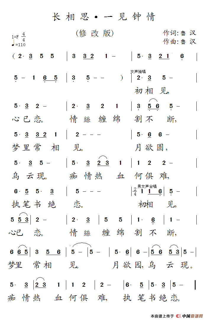 长相思·一见钟情曲谱是由作词:鲁汉作曲:鲁汉格式:简谱,上传:秋叶起舞,版权归原作者所有。