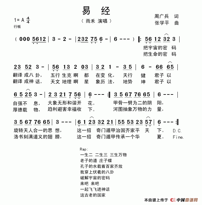 易经曲谱是由作词:周广兵作曲:张学平格式:简谱,上传:张学平,版权归原作者所有。