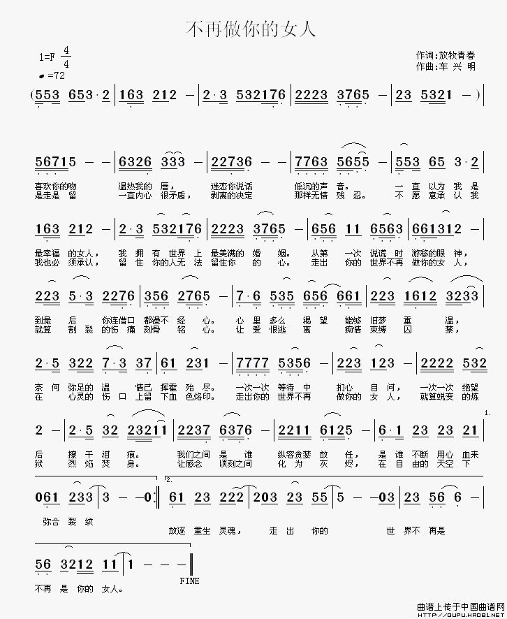 不再做你的女人曲谱是由作词:放牧青春作曲:车兴明格式:简谱,上传:车兴明,版权归原作者所有。