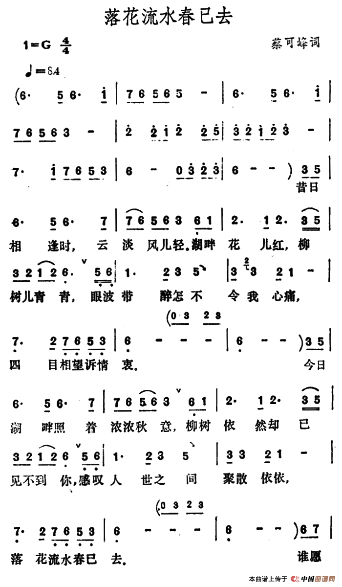 落花流水春已去曲谱是由作词:蔡可峰演唱(奏):李玲玉格式:简谱,上传:秋叶起舞,版权归原作者所有。