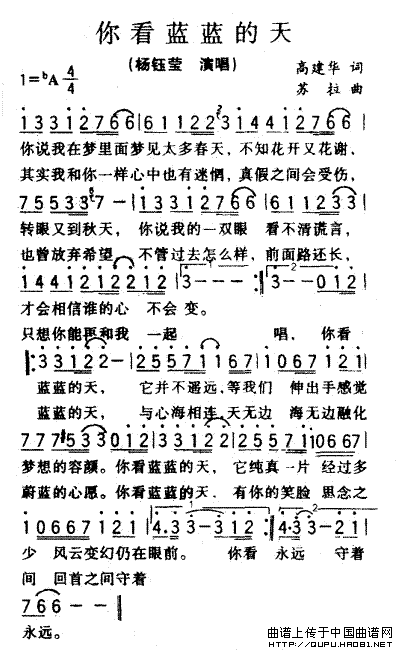你看蓝蓝的天曲谱是由作词:高建华作曲:苏拉演唱(奏):杨钰莹格式:简谱,上传:秋叶起舞,版权归原作者所有。
