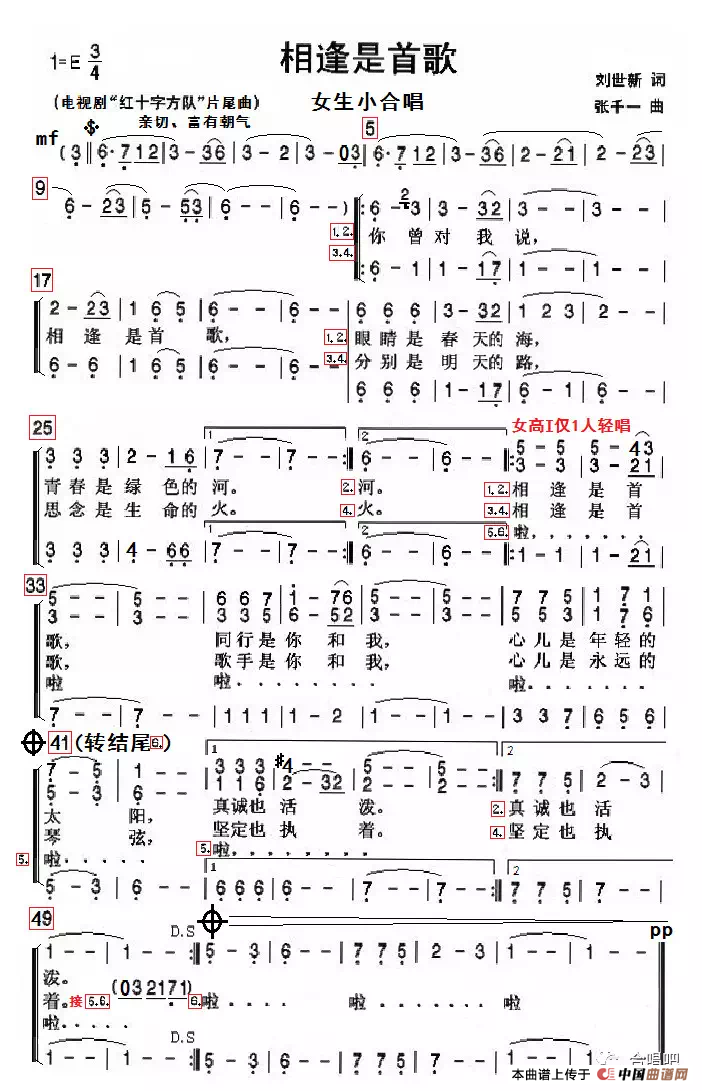 相逢是首歌曲谱是由作词:刘世新作曲:张千一,上传:雅韵清歌,版权归原作者所有。