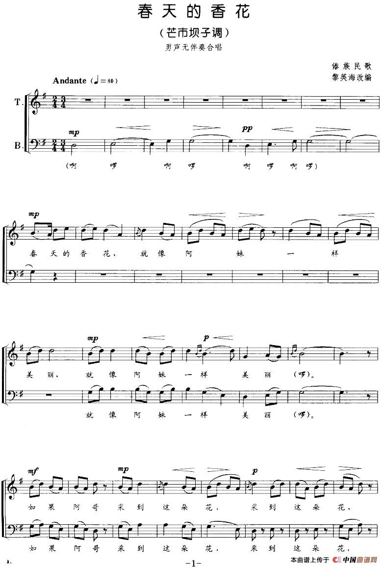 春天的香花(芒市坝子调)(男声无伴奏合唱、五线谱)曲谱是由作曲:傣族民歌黎英海改编,上传:热爱音乐88,版权归原作者所有。