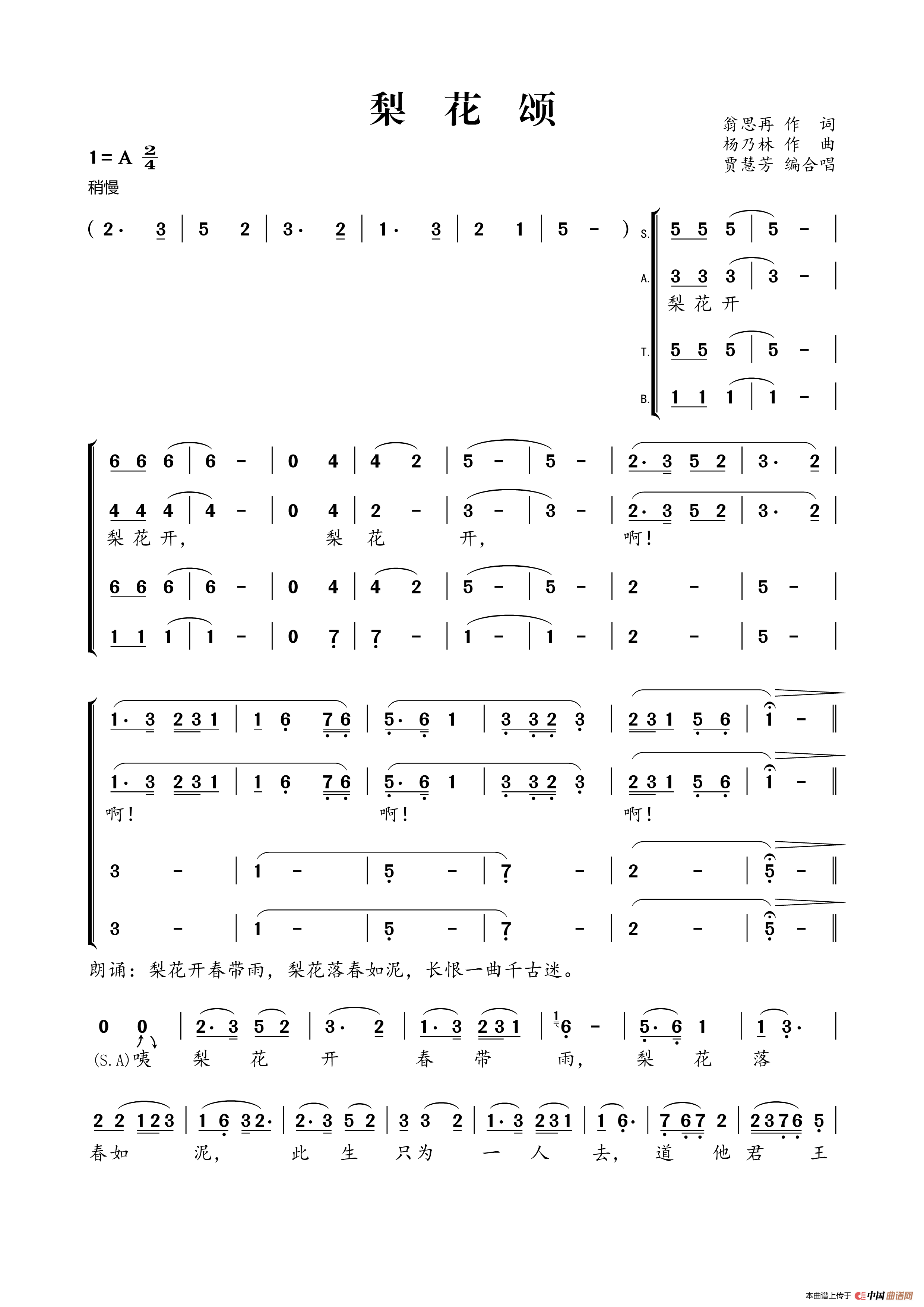 梨花颂(贾慧芳编合唱)曲谱是由作词:翁思再作曲:杨乃林,上传:沉舟侧畔过,版权归原作者所有。