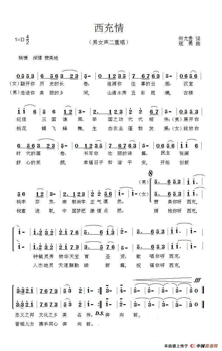 西充情曲谱是由作词:何尤贵作曲:寇勇演唱(奏):寇勇谭孜,上传:寇勇原创音乐,版权归原作者所有。