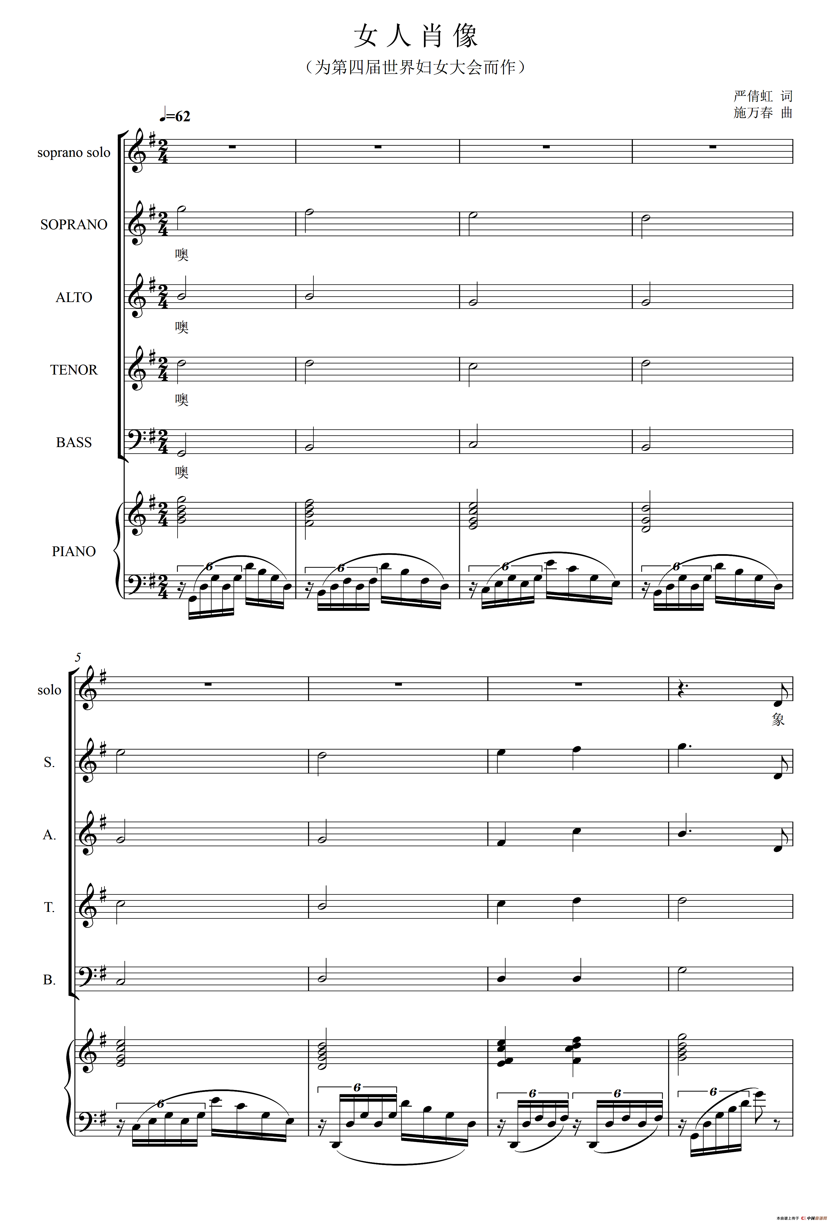 女人肖像(为第四届世界妇女大会而作)(正谱)曲谱是由作词:严倩虹作曲:施万春演唱(奏):高磊领唱,上传:沉舟侧畔过,版权归原作者所有。