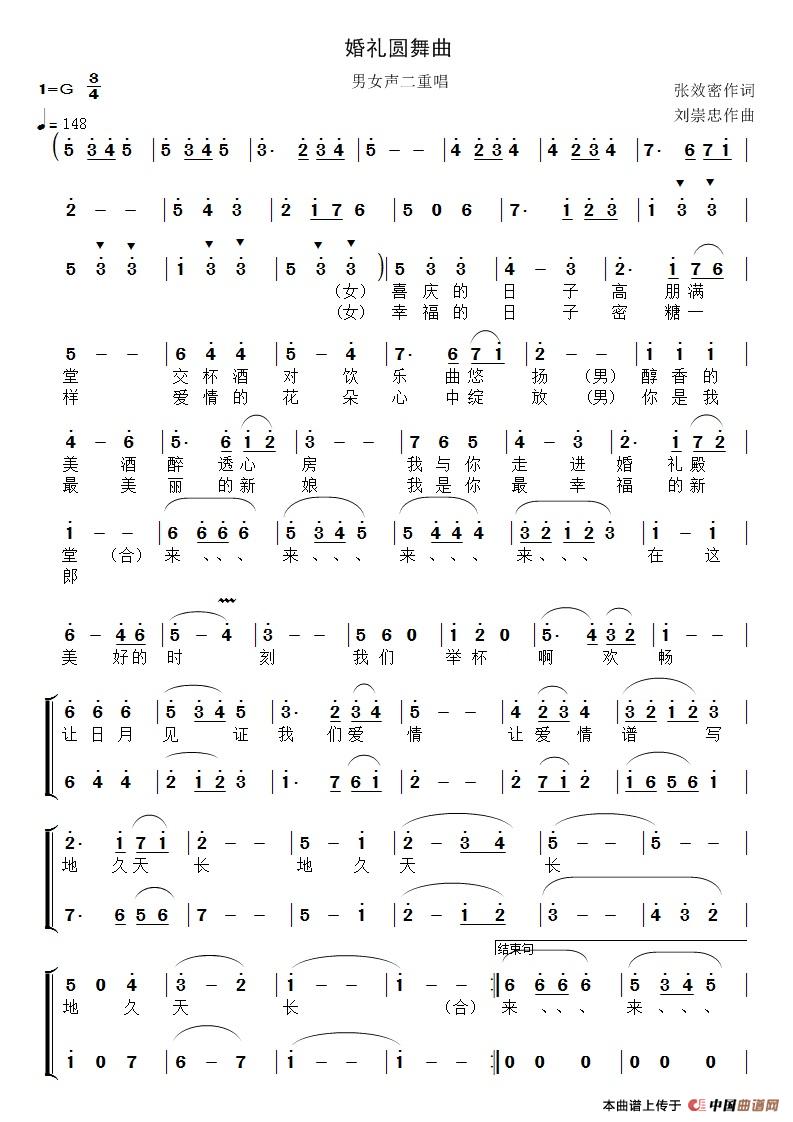 婚礼圆舞曲(张效密词 刘崇忠曲、二重唱)曲谱是由作词:张效密作曲:刘崇忠演唱(奏):王月华、吕洪义,上传:沉舟侧畔过,版权归原作者所有。