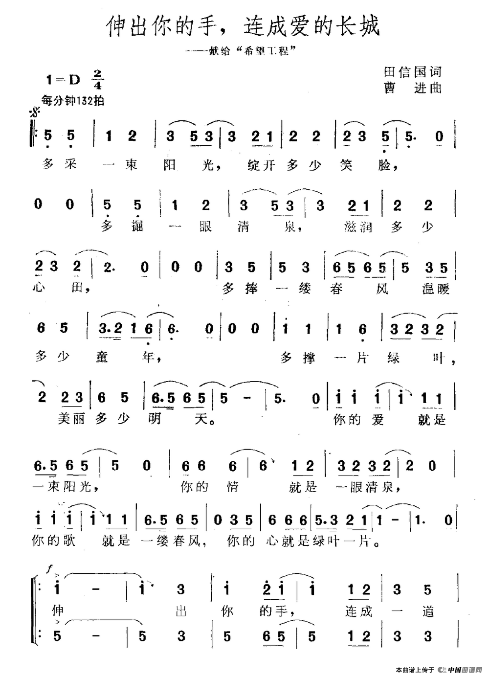 伸出你的手,连成爱的长城(献给“希望工程”)曲谱是由作词:田信国作曲:曹进,上传:沉舟侧畔过,版权归原作者所有。