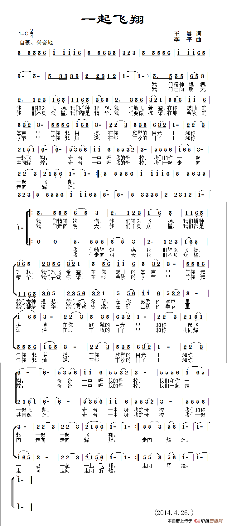 一起飞翔(王晨词 李平曲)曲谱是由作词:王晨作曲:李平演唱(奏):罗锡贵vs画桥烟柳,上传:李平(奇台),版权归原作者所有。