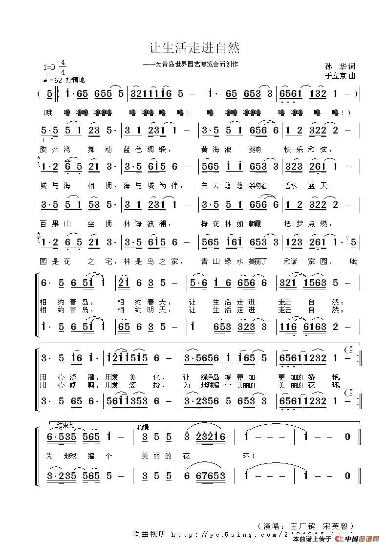 让生活走进自然(孙华词 于立京曲)曲谱是由作词:孙华作曲:于立京演唱(奏):王广镔宋英智,上传:于立京,版权归原作者所有。