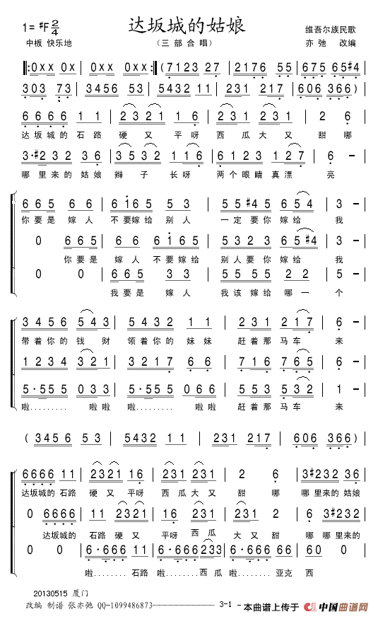 达坂城的姑娘(亦弛改编)(三部合唱)曲谱是由作词:维吾尔族民歌作曲:亦弛改编演唱(奏):合唱团,上传:咪迷米张亦弛,版权归原作者所有。