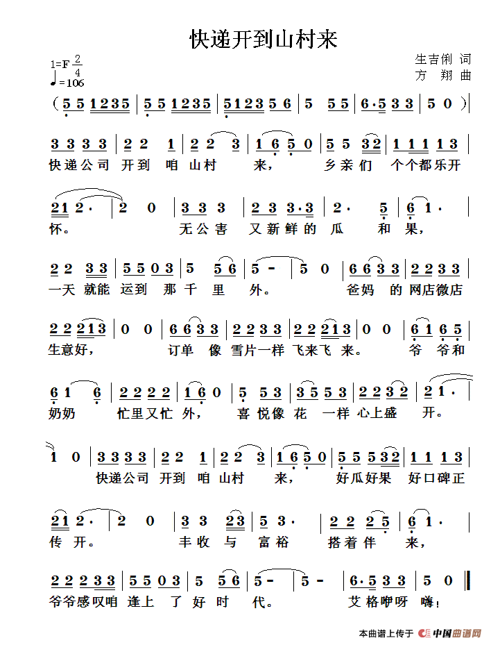 快递开到山村来曲谱是由作词:生吉俐作曲:方翔,上传:车里子,版权归原作者所有。