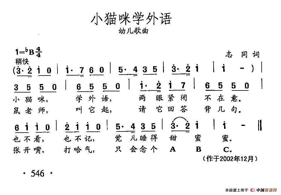 田光歌曲选-424小猫咪学外语曲谱是由作词:志同作曲:田光,上传:瓦莲金娜AA,版权归原作者所有。