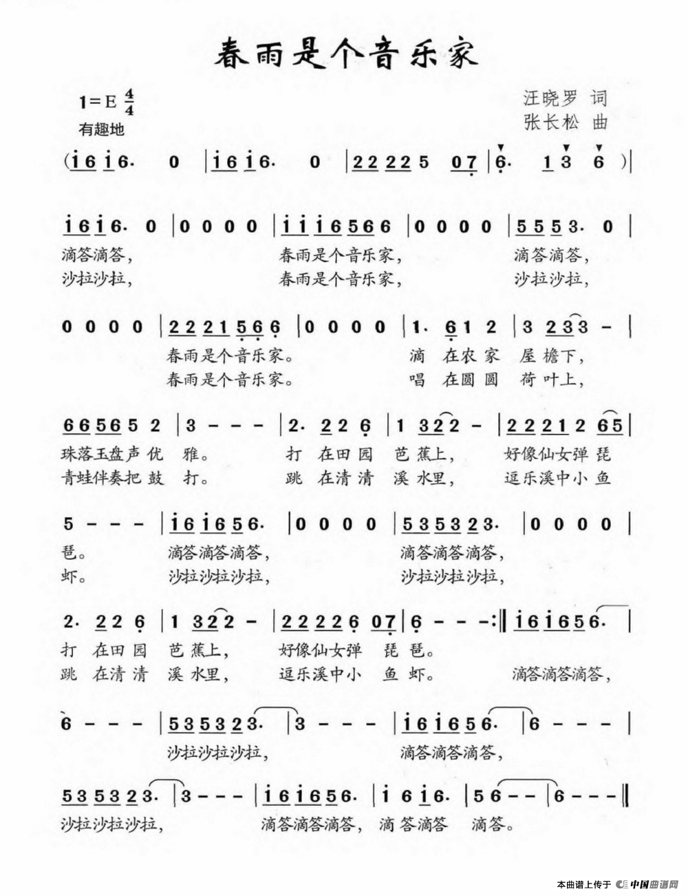 春雨是个音乐家(汪晓罗词 张长松曲)曲谱是由作词:汪晓罗作曲:张长松,上传:沉舟侧畔过,版权归原作者所有。