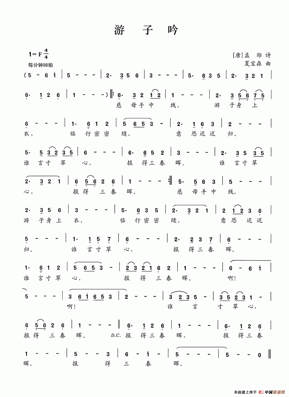 游子吟([唐]孟郊词 夏宝森曲)曲谱是由作词:[唐]孟郊作曲:夏宝森,上传:沉舟侧畔过,版权归原作者所有。