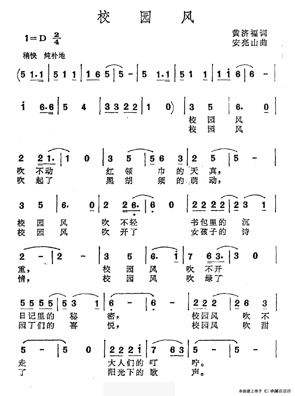 校园风(黄济福词 安亮山曲)曲谱是由作词:黄济福作曲:安亮山,上传:沉舟侧畔过,版权归原作者所有。