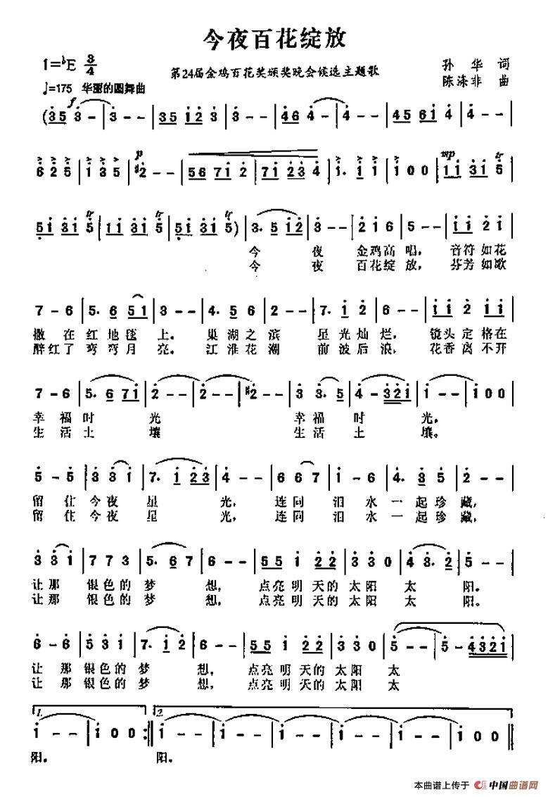 今夜百花绽放曲谱是由作词:孙华作曲:陈涤非,上传:陈涤非,版权归原作者所有。