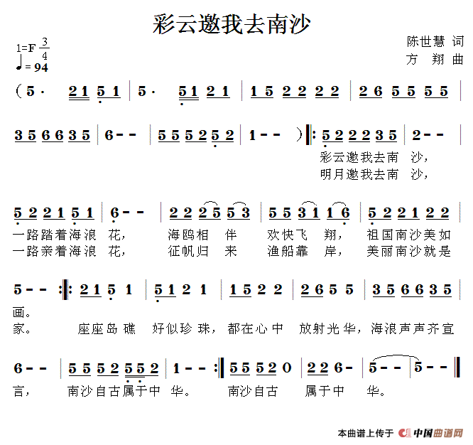 彩云邀我去南沙曲谱是由作词:陈世慧作曲:方翔,上传:秋叶起舞,版权归原作者所有。