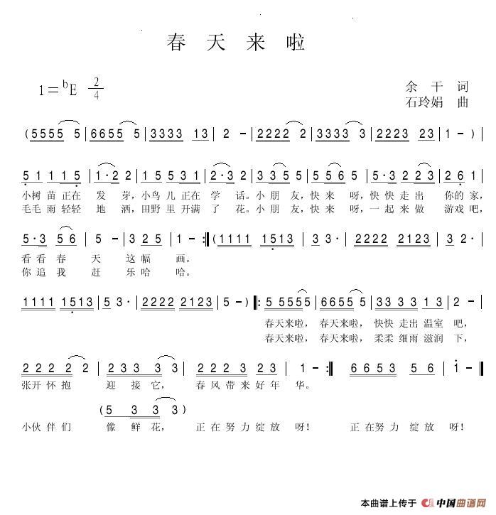 春天来啦(余干词 石玲娟曲)曲谱是由作词:余干作曲:石玲娟,上传:石玲娟,版权归原作者所有。