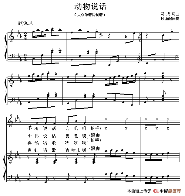 动物说话(马成词曲、欣墟配伴奏、正谱)曲谱是由作词:马成作曲:马成作曲、欣墟配伴奏,上传:秋叶起舞,版权归原作者所有。