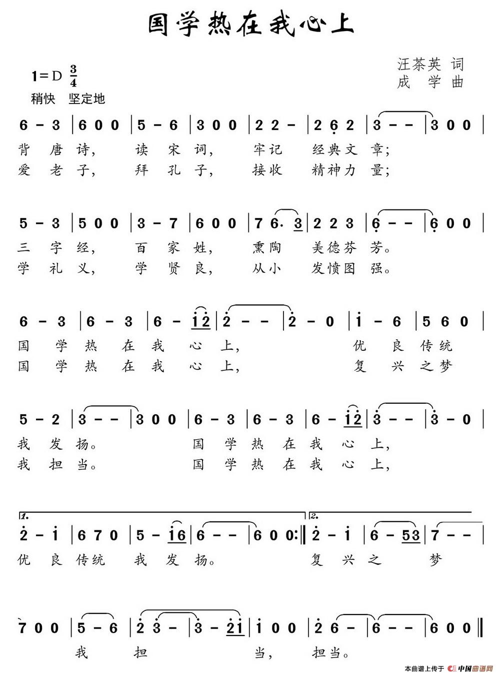 国学热在我心上(汪茶英词 成学曲)曲谱是由作词:汪茶英作曲:成学,上传:沉舟侧畔过,版权归原作者所有。