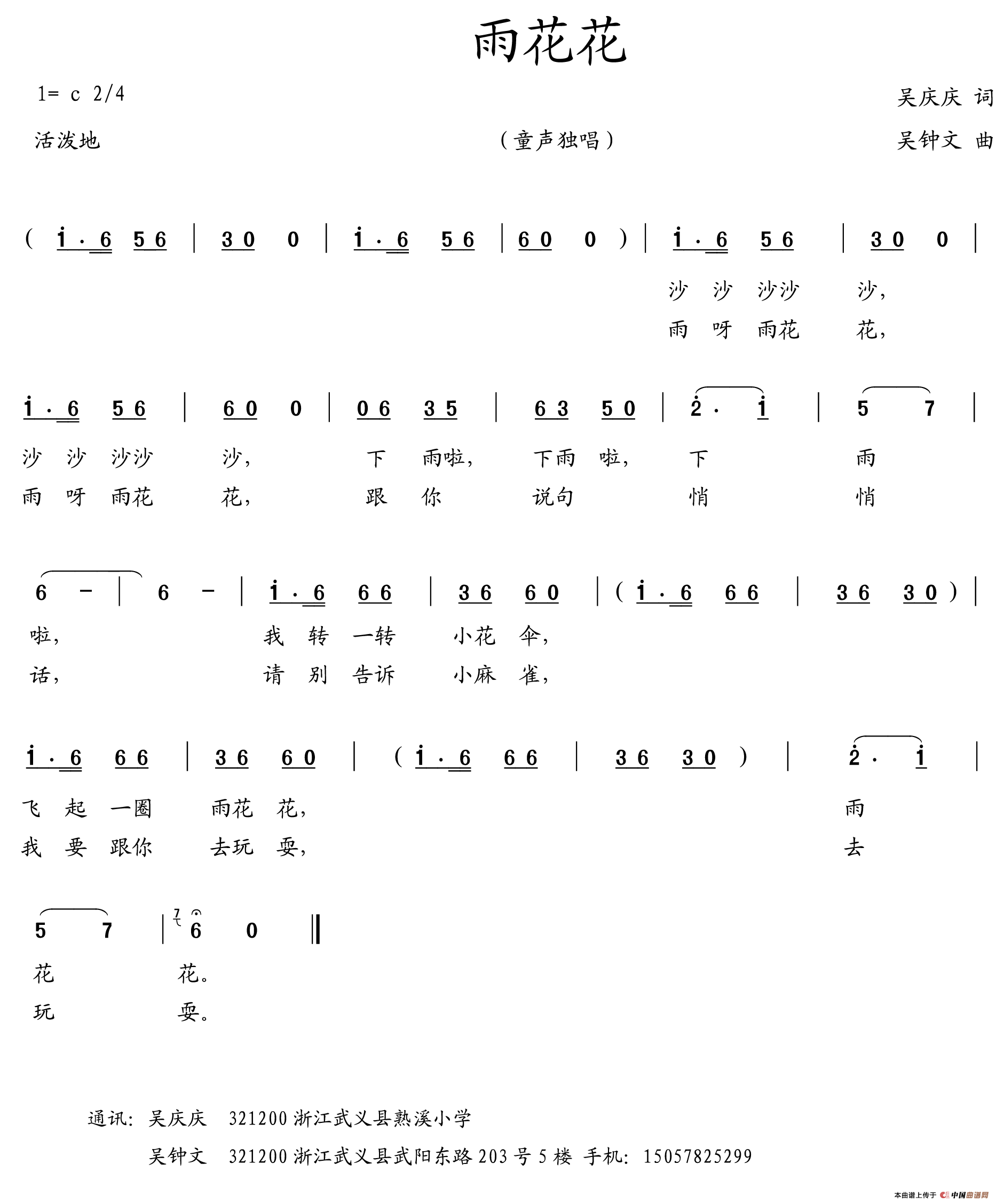雨花花(吴庆庆词 吴钟文曲)曲谱是由作词:吴庆庆作曲:吴钟文演唱(奏):吴庆庆,上传:吴钟文,版权归原作者所有。