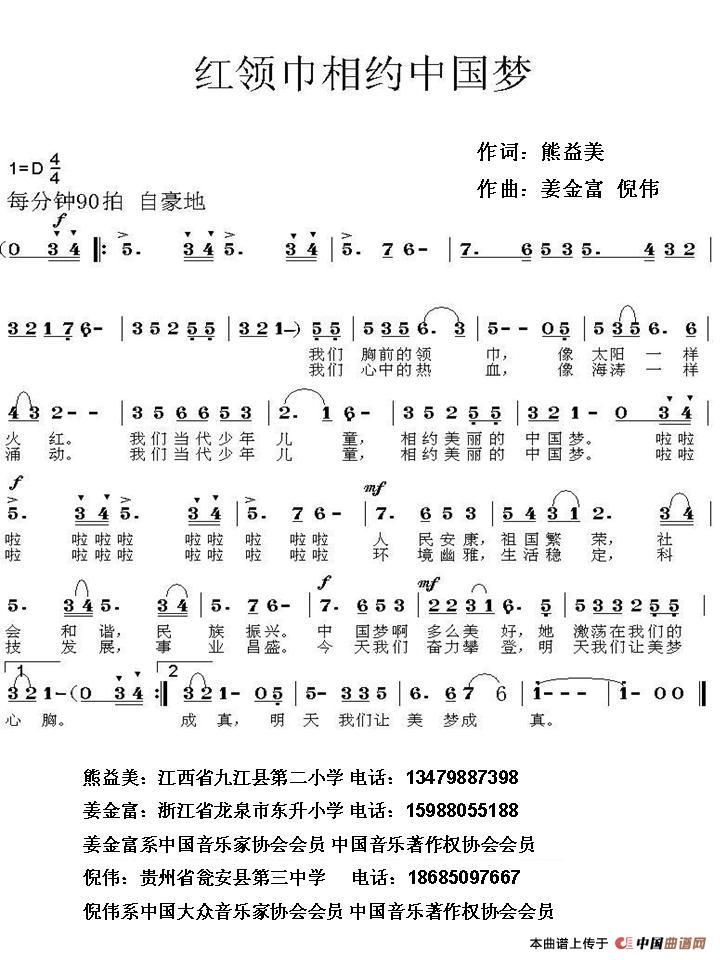 红领巾相约中国梦(熊益美词 姜金富 倪伟曲)曲谱是由作词:熊益美作曲:姜金富倪伟演唱(奏):齐琪,上传:倪伟,版权归原作者所有。