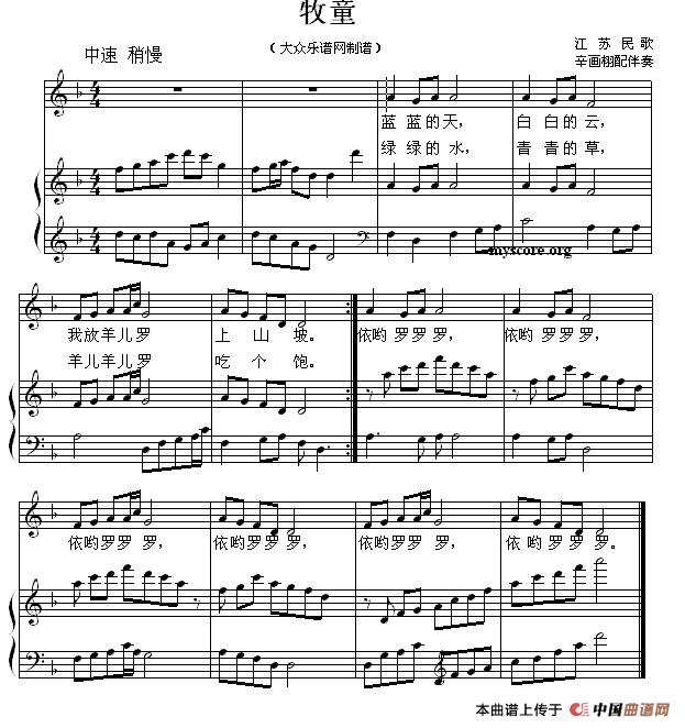 牧童(江苏民歌、辛画栩编配、正谱)曲谱是由作曲:辛画栩配伴奏,上传:秋叶起舞,版权归原作者所有。