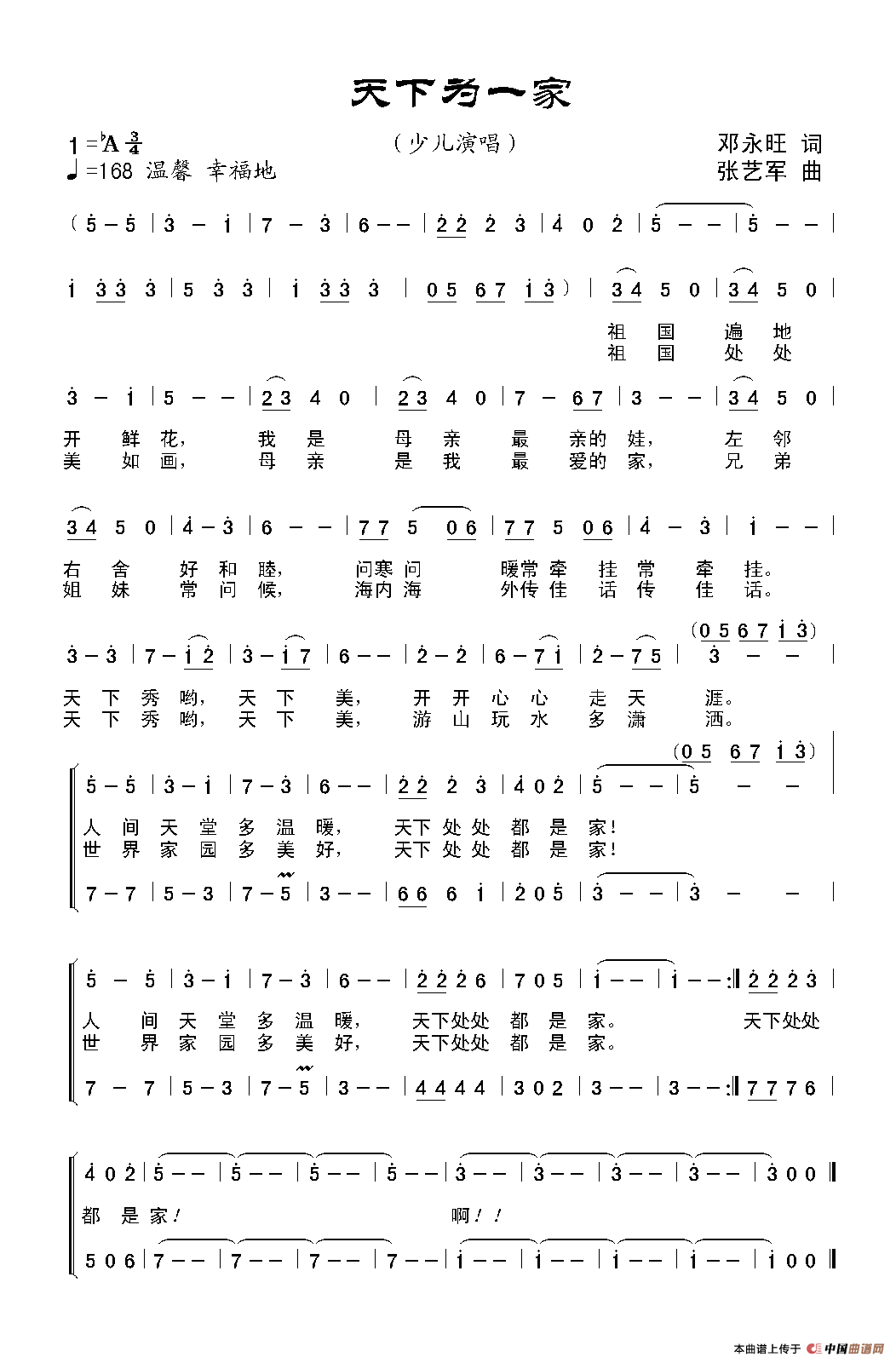 天下为一家(合唱)曲谱是由作词:邓永旺作曲:张艺军,上传:秋叶起舞,版权归原作者所有。
