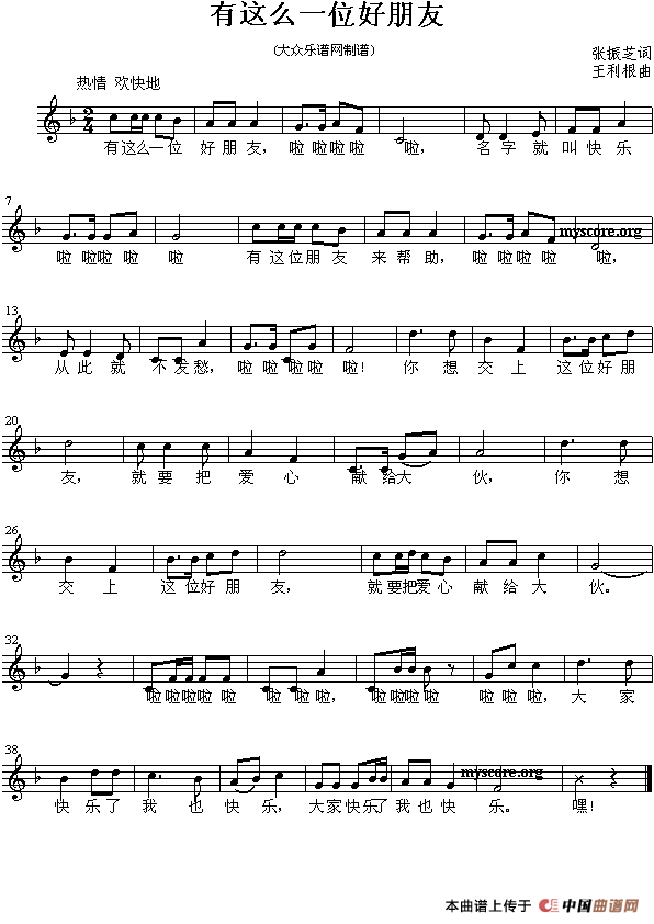 温馨提示:想要保存有这么一位好朋友简谱,歌颂真挚友谊之歌曲谱?在曲谱图片上单击右键,选择"图片另存为...",即可将该曲谱保存到您的电脑本地,想要打印出来?将图片插入到WORD中,调整合适到大小打印即可。