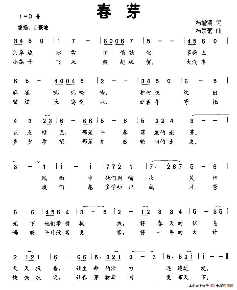 春芽曲谱是由作词:冯增清作曲:冯京菊格式:简谱,上传:秋叶起舞,版权归原作者所有。