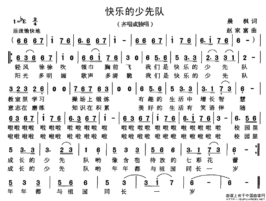 快乐的少先队(晨枫词 赵家富曲)曲谱是由作词:晨枫作曲:赵家富格式:简谱,上传:秋叶起舞,版权归原作者所有。