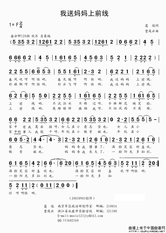 我送妈妈上前线曲谱是由作词:葛逊作曲:贾庭云格式:简谱,上传:秋叶起舞,版权归原作者所有。