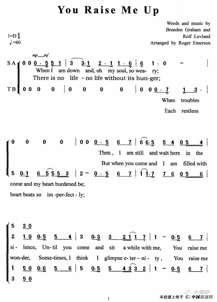 温馨提示:想要保存You Raise Me Up(合唱版)简谱,温暖励志的经典歌曲曲谱?在曲谱图片上单击右键,选择"图片另存为...",即可将该曲谱保存到您的电脑本地,想要打印出来?将图片插入到WORD中,调整合适到大小打印即可。