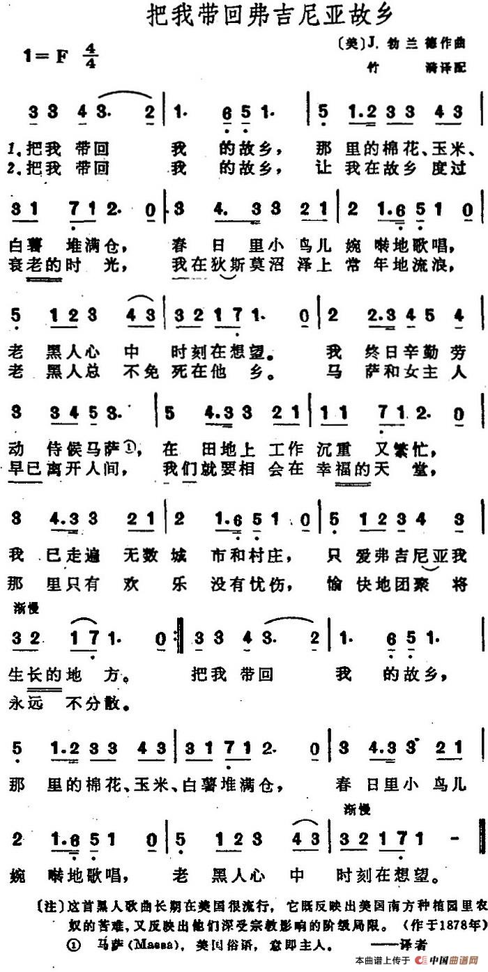 把我带回弗吉尼亚故乡曲谱是由作词:竹漪译配作曲:[美]J.勃兰德,上传:热爱音乐88,版权归原作者所有。