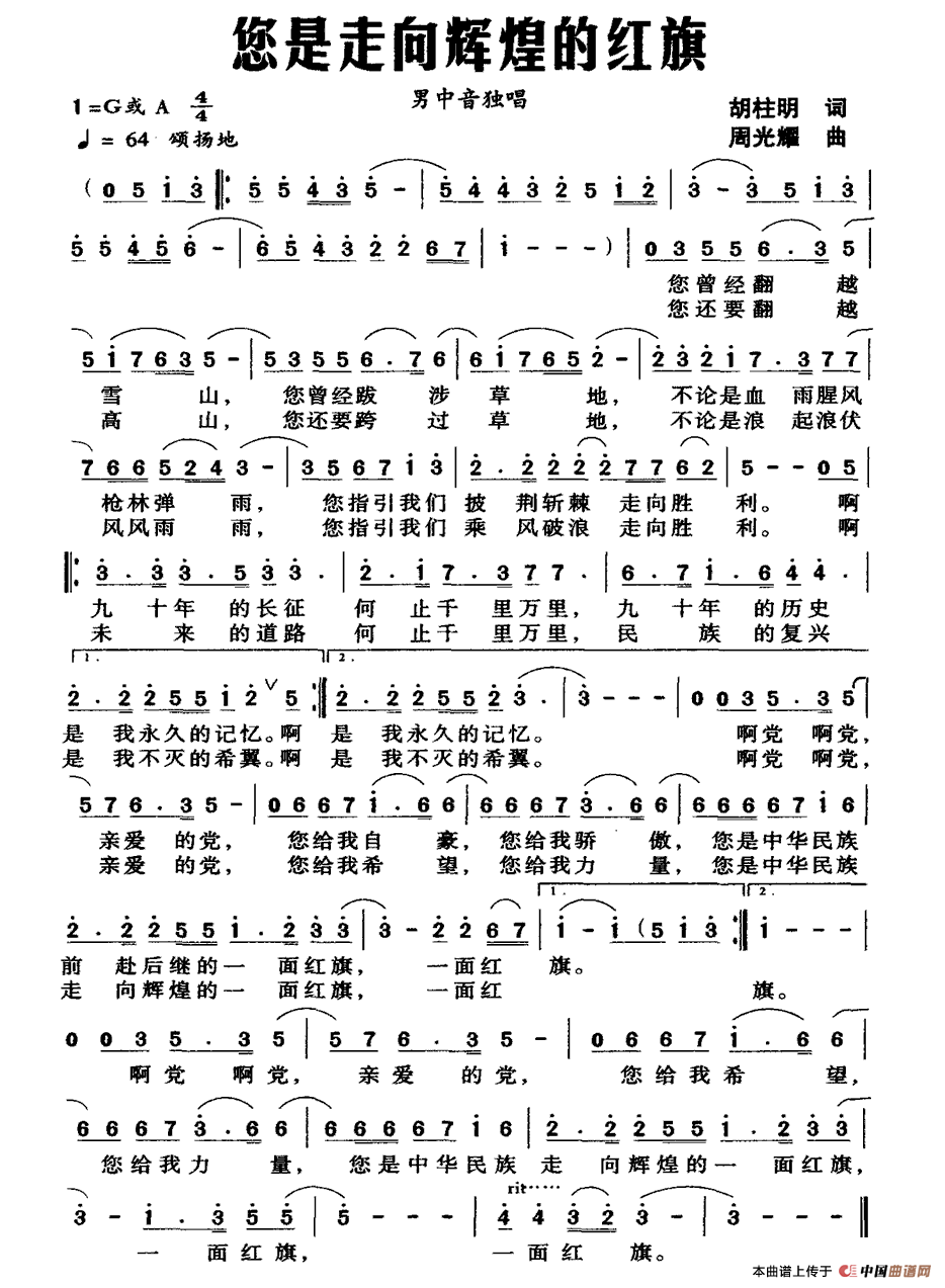 您是走向辉煌的红旗(胡柱明词 周光耀曲)曲谱是由作词:胡柱明作曲:周光耀,上传:秋叶起舞,版权归原作者所有。