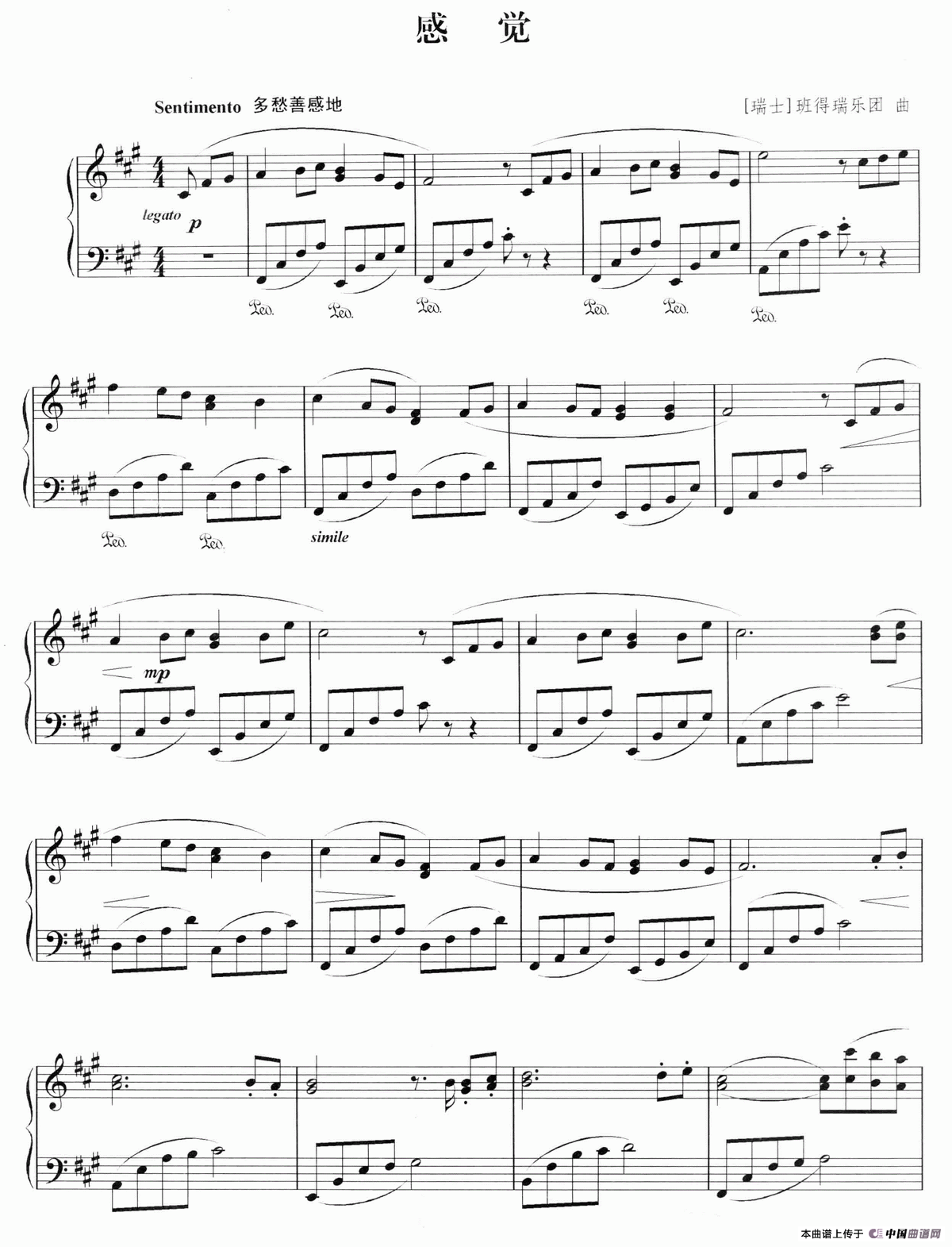 温馨提示:想要保存感觉钢琴谱,触动心灵的旋律曲谱?在曲谱图片上单击右键,选择"图片另存为...",即可将该曲谱保存到您的电脑本地,想要打印出来?将图片插入到WORD中,调整合适到大小打印即可。