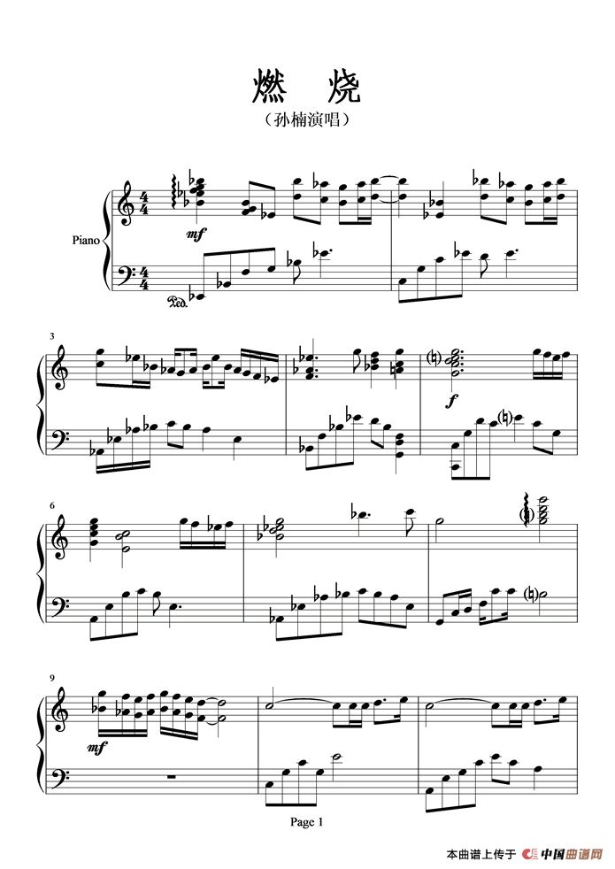温馨提示:想要保存《燃烧(孙楠演唱版)》钢琴谱,激昂歌声燃情四溢曲谱?在曲谱图片上单击右键,选择"图片另存为...",即可将该曲谱保存到您的电脑本地,想要打印出来?将图片插入到WORD中,调整合适到大小打印即可。