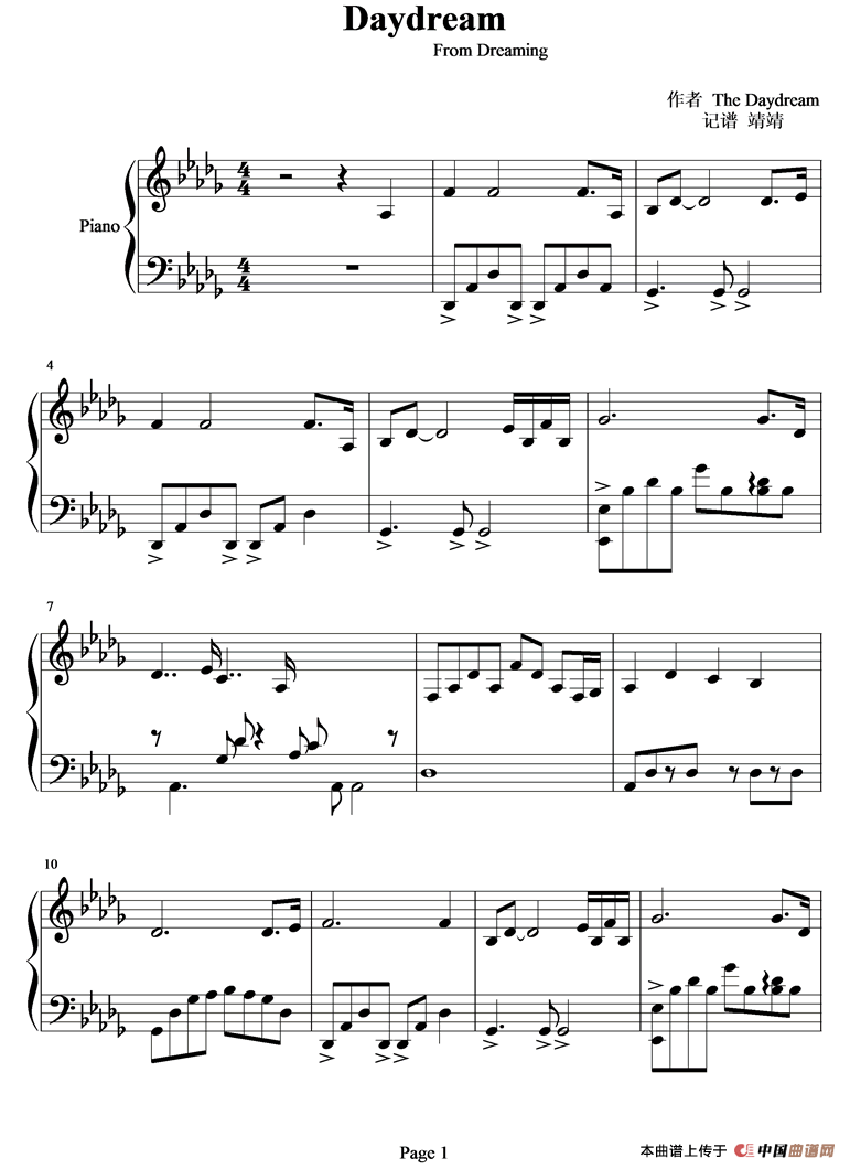 温馨提示:想要保存Daydream 钢琴谱,舒缓的白日梦曲调曲谱?在曲谱图片上单击右键,选择"图片另存为...",即可将该曲谱保存到您的电脑本地,想要打印出来?将图片插入到WORD中,调整合适到大小打印即可。