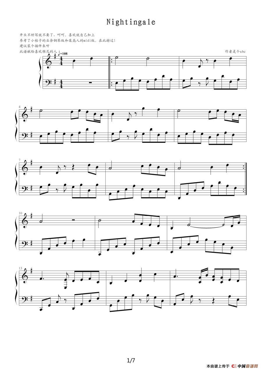 温馨提示:想要保存《Nightingale(夜莺)》钢琴谱,天籁之音婉转悠扬曲谱?在曲谱图片上单击右键,选择"图片另存为...",即可将该曲谱保存到您的电脑本地,想要打印出来?将图片插入到WORD中,调整合适到大小打印即可。