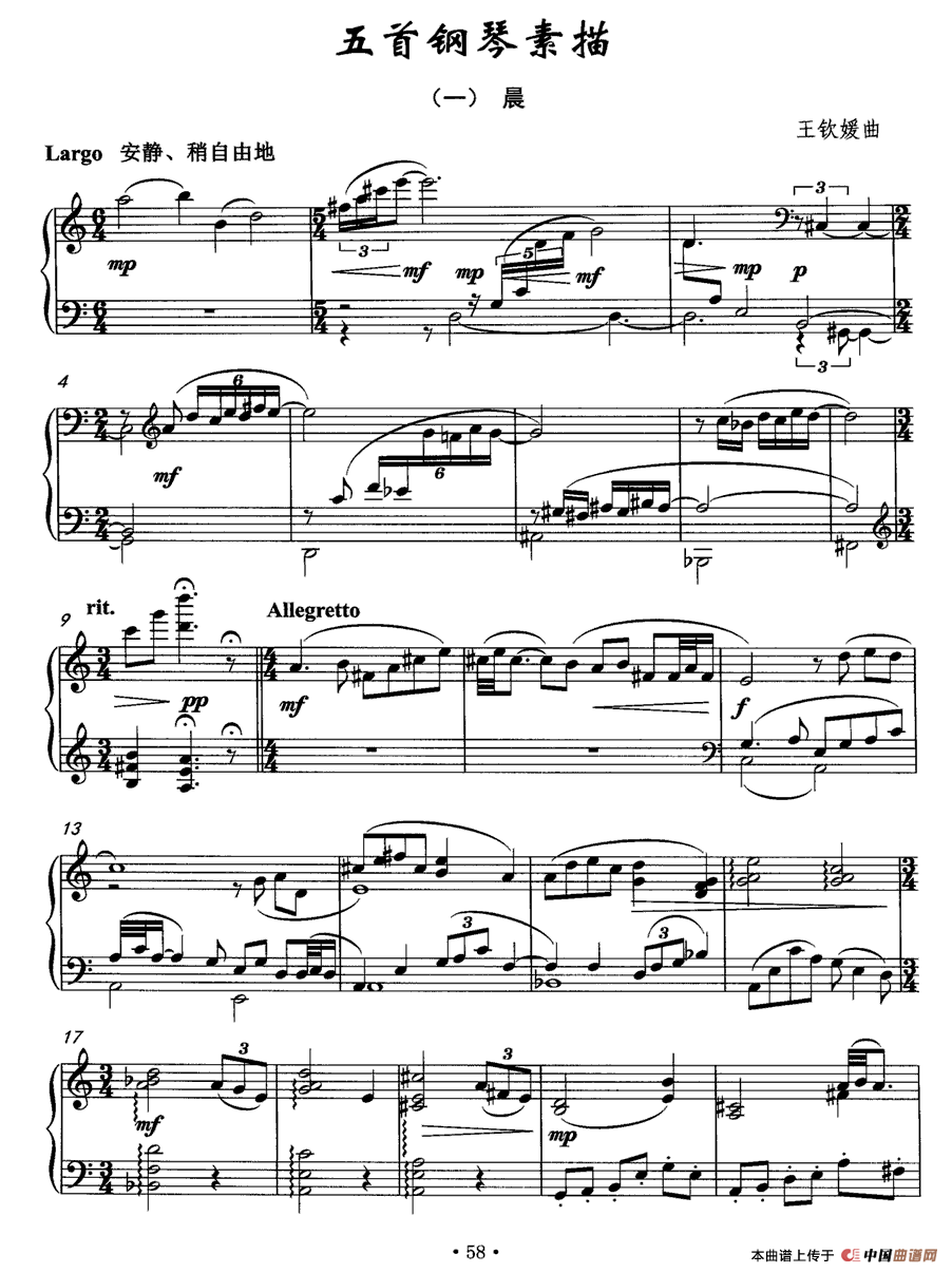 温馨提示:想要保存《五首钢琴素描(一)晨》钢琴谱,描绘清晨宁静之美曲谱?在曲谱图片上单击右键,选择"图片另存为...",即可将该曲谱保存到您的电脑本地,想要打印出来?将图片插入到WORD中,调整合适到大小打印即可。