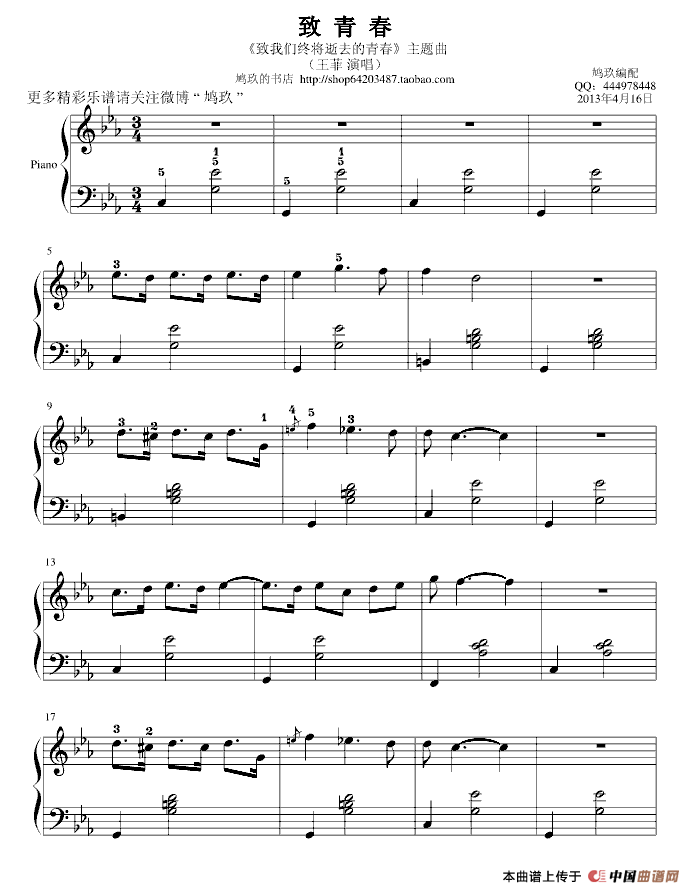 温馨提示:想要保存致青春钢琴谱,回忆青春的旋律 致青春钢琴谱,谱写青春的乐章 致青春钢琴谱,唱出青春的梦想曲谱?在曲谱图片上单击右键,选择"图片另存为...",即可将该曲谱保存到您的电脑本地,想要打印出来?将图片插入到WORD中,调整合适到大小打印即可。