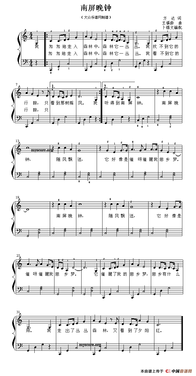 温馨提示:想要保存南屏晚钟(钢琴简易弹唱),悠扬旋律诉说深情 南屏晚钟(钢琴简易弹唱),独特意境韵味悠长 南屏晚钟(钢琴简易弹唱),淡淡忧伤萦绕心间曲谱?在曲谱图片上单击右键,选择"图片另存为...",即可将该曲谱保存到您的电脑本地,想要打印出来?将图片插入到WORD中,调整合适到大小打印即可。