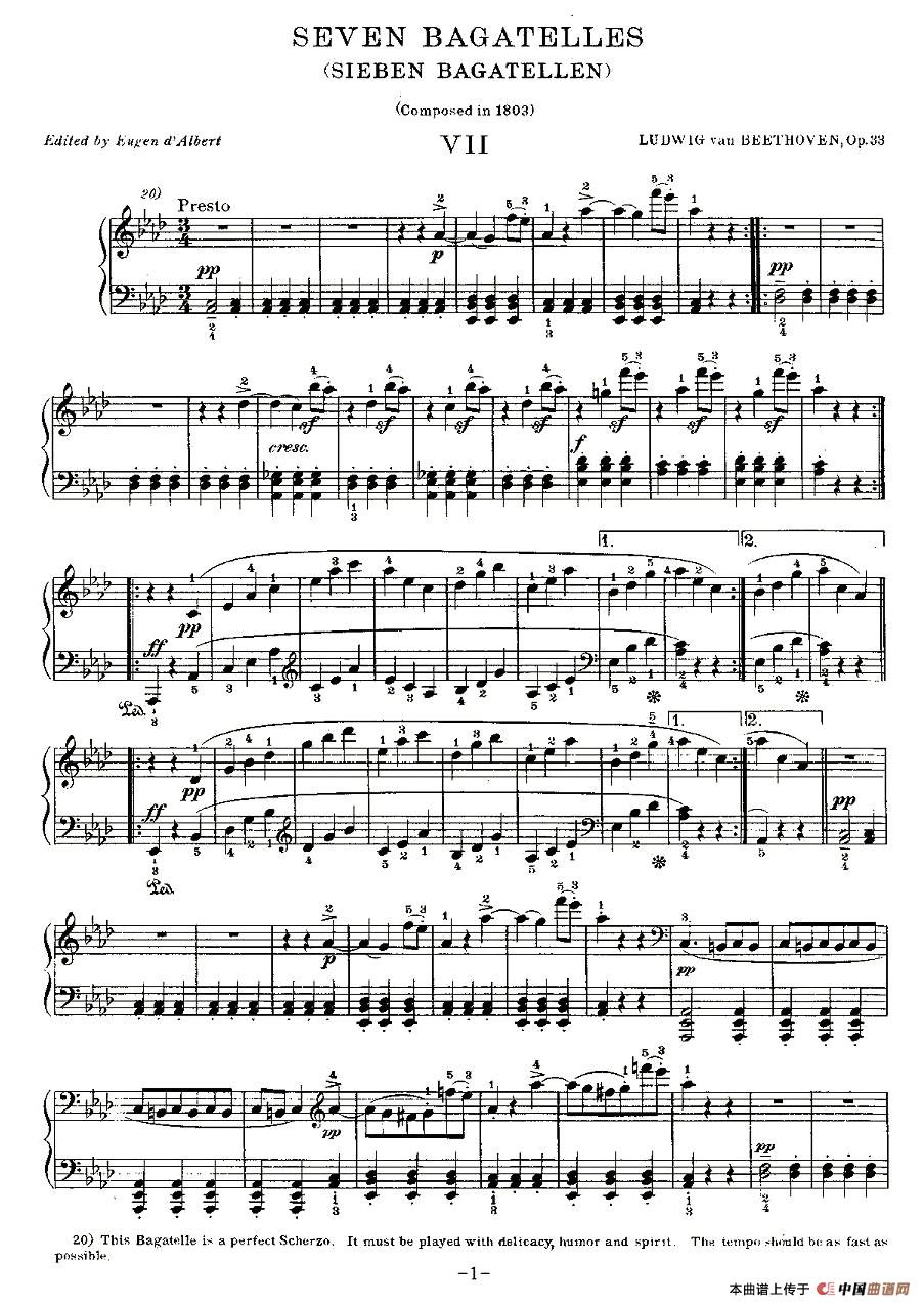 温馨提示:想要保存贝多芬钢琴小品(Bagatelles)(Op.33之7)钢琴谱,轻快小品充满灵动 贝多芬钢琴小品(Bagatelles)(Op.33之7)钢琴谱,经典之作韵味悠长 贝多芬钢琴小品(Bagatelles曲谱?在曲谱图片上单击右键,选择"图片另存为...",即可将该曲谱保存到您的电脑本地,想要打印出来?将图片插入到WORD中,调整合适到大小打印即可。