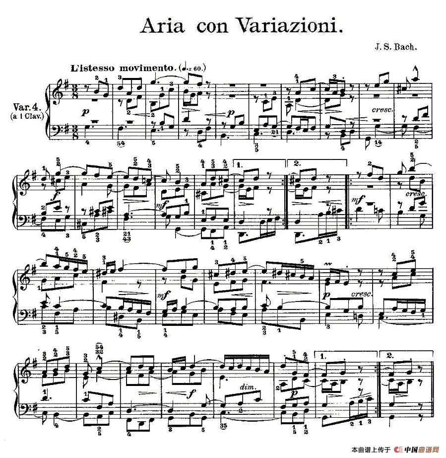 温馨提示:想要保存AriaconVariazioni之四钢琴谱,感受古典音乐魅力曲谱?在曲谱图片上单击右键,选择"图片另存为...",即可将该曲谱保存到您的电脑本地,想要打印出来?将图片插入到WORD中,调整合适到大小打印即可。