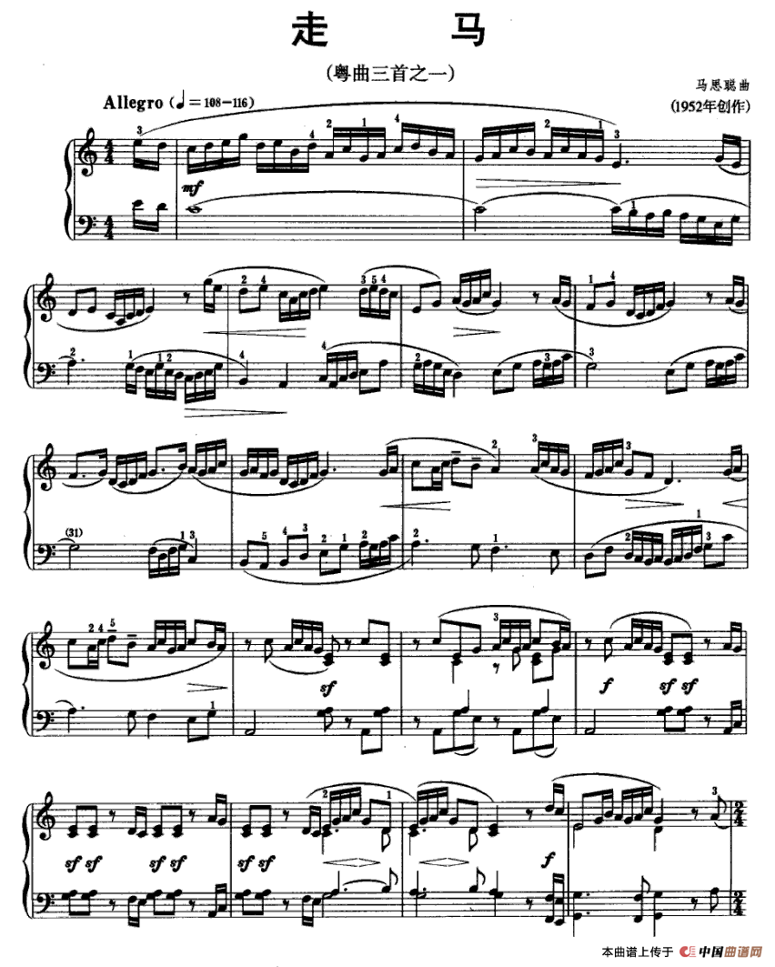 温馨提示:想要保存《走马(粤曲三首之一)》钢琴谱,展现别样粤曲风情曲谱?在曲谱图片上单击右键,选择"图片另存为...",即可将该曲谱保存到您的电脑本地,想要打印出来?将图片插入到WORD中,调整合适到大小打印即可。
